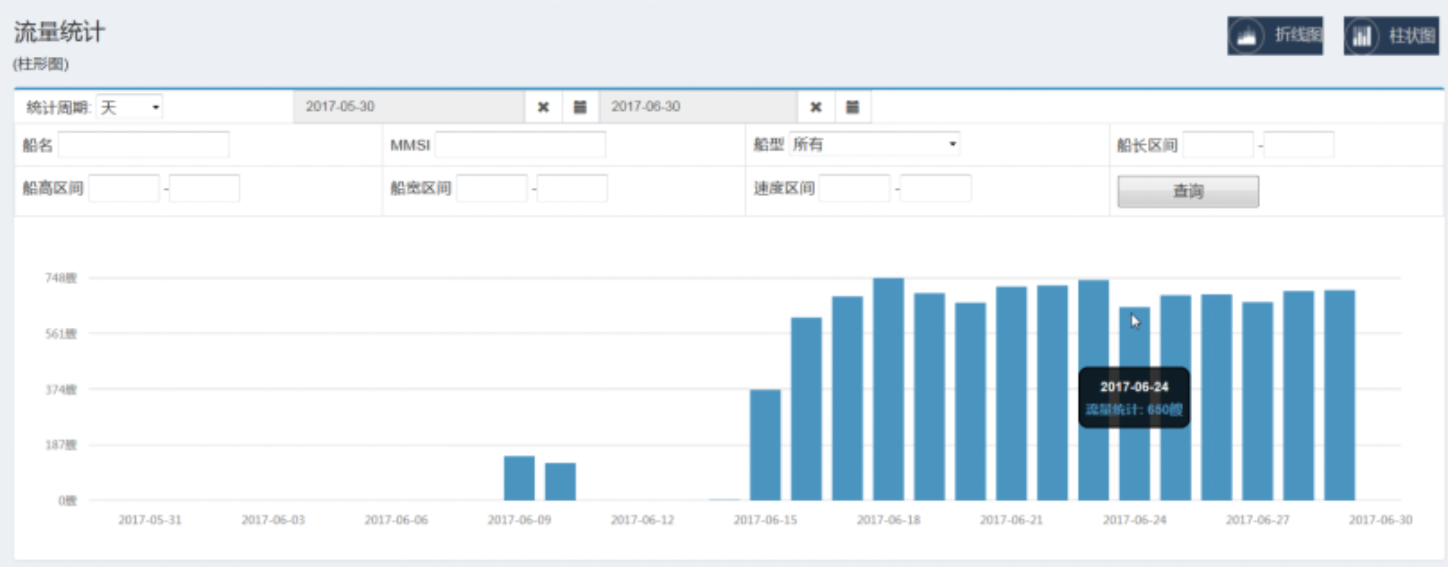 基于一船一航一档,自动按航向、船型(小/中/大)、船舶种类统计船舶流量,导出报表。