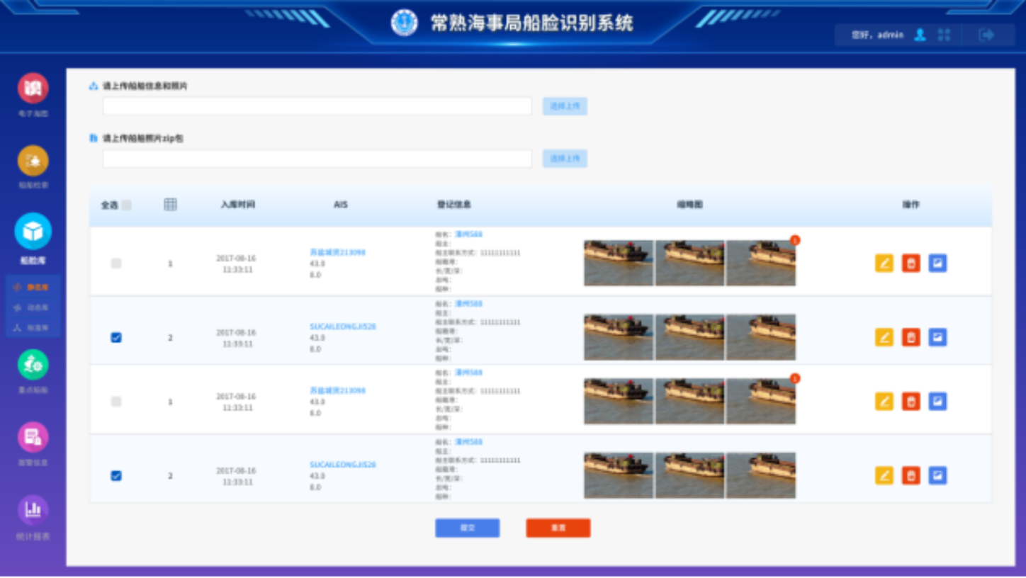 在船舶AIS未开、船舶字符被遮挡情况下,智能卡口可抓拍船舶信息,智能识别船名、船种、船舶特征;根据每艘船舶不同的固定特征:如空调外机、门、国旗、轮胎、救生圈、探照灯等特征建设船脸数据库,包括静态库、动态库和标准库;对于首次识别船舶则自我建库,对于多次识别船舶则以图搜图,根据船舶图片,输出船舶身份信息。